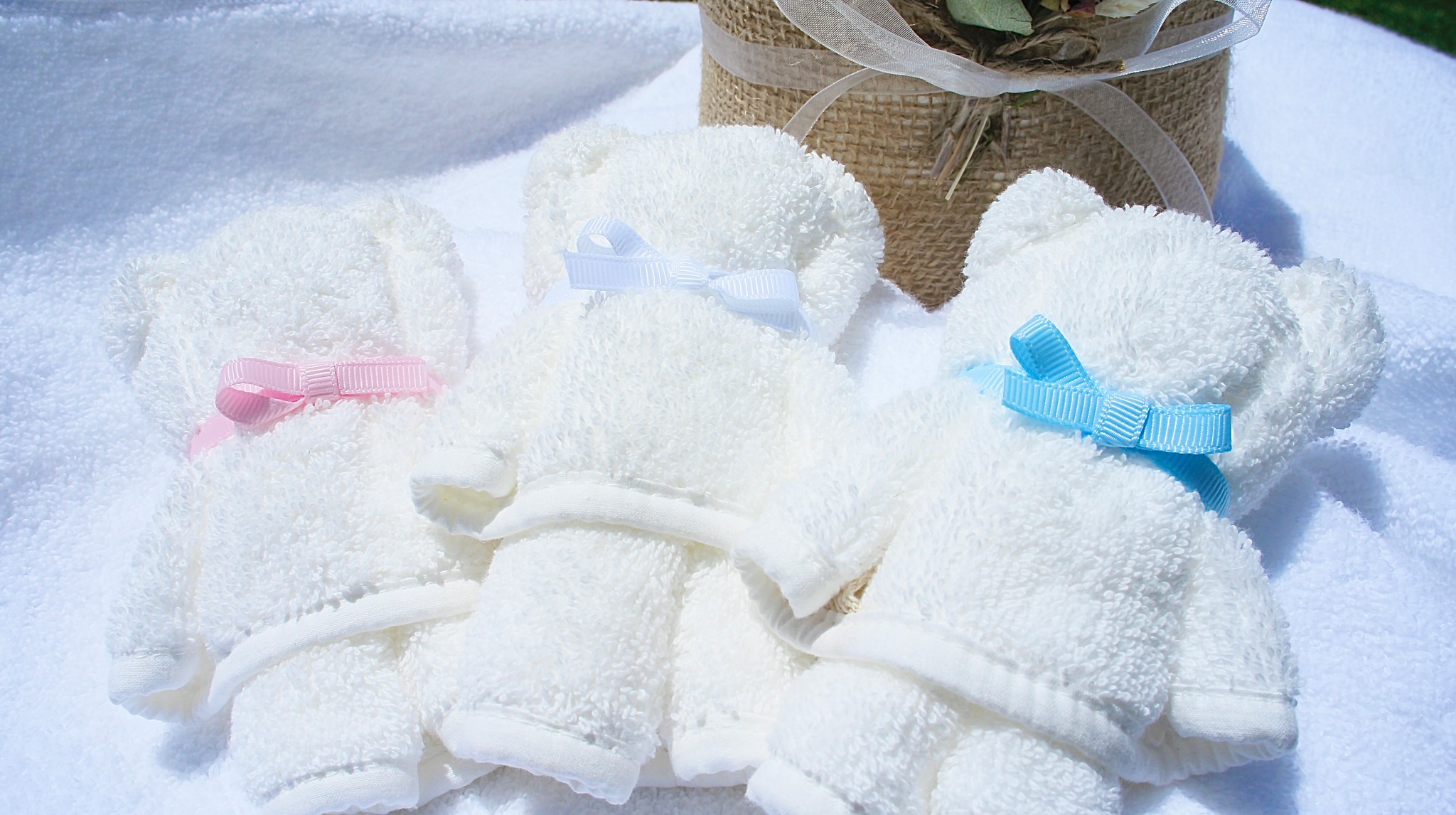 おむつケーキの隣にいるこのくまちゃんタオル。