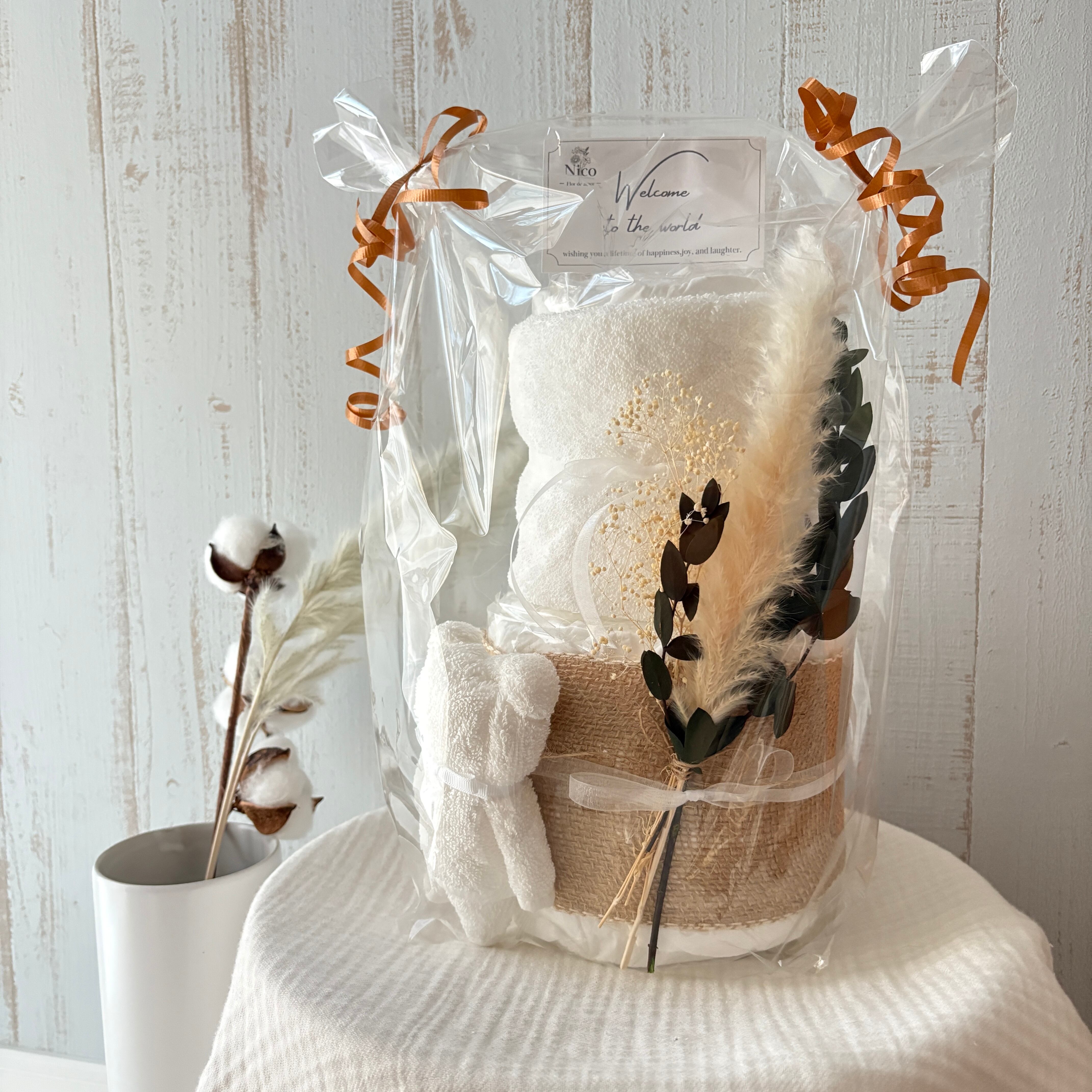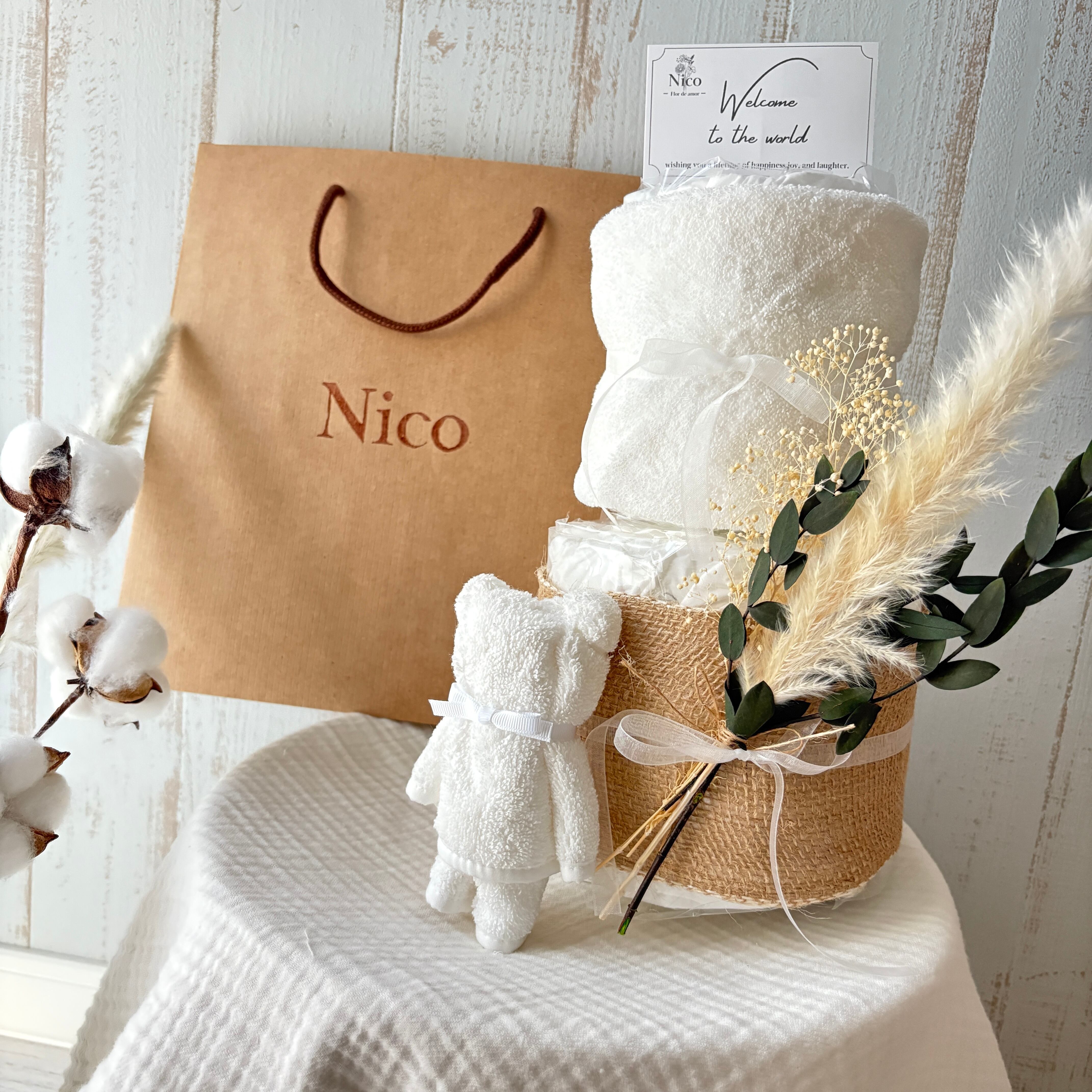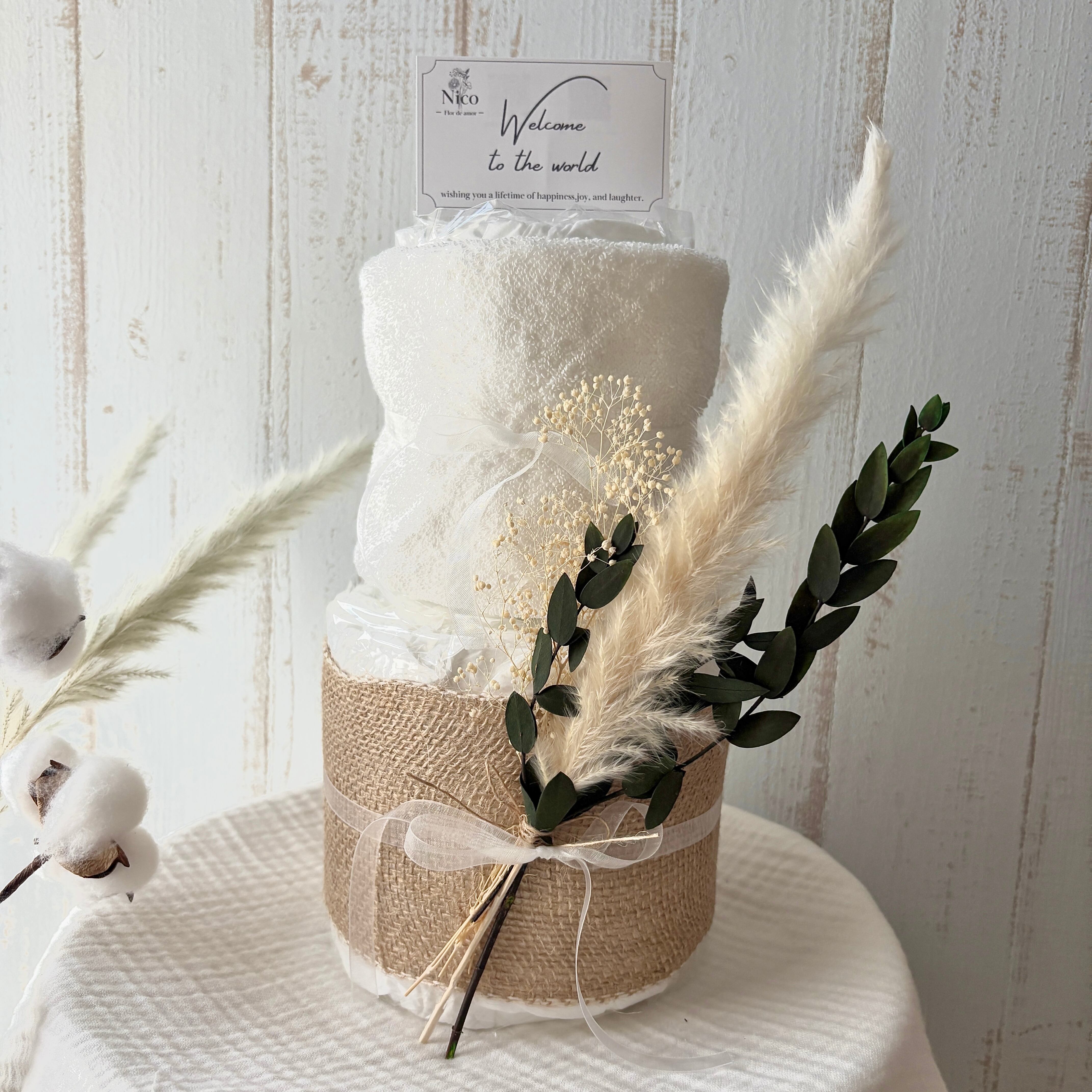 ベビーシャワーや出産祝いにぴったりのおむつケーキ。