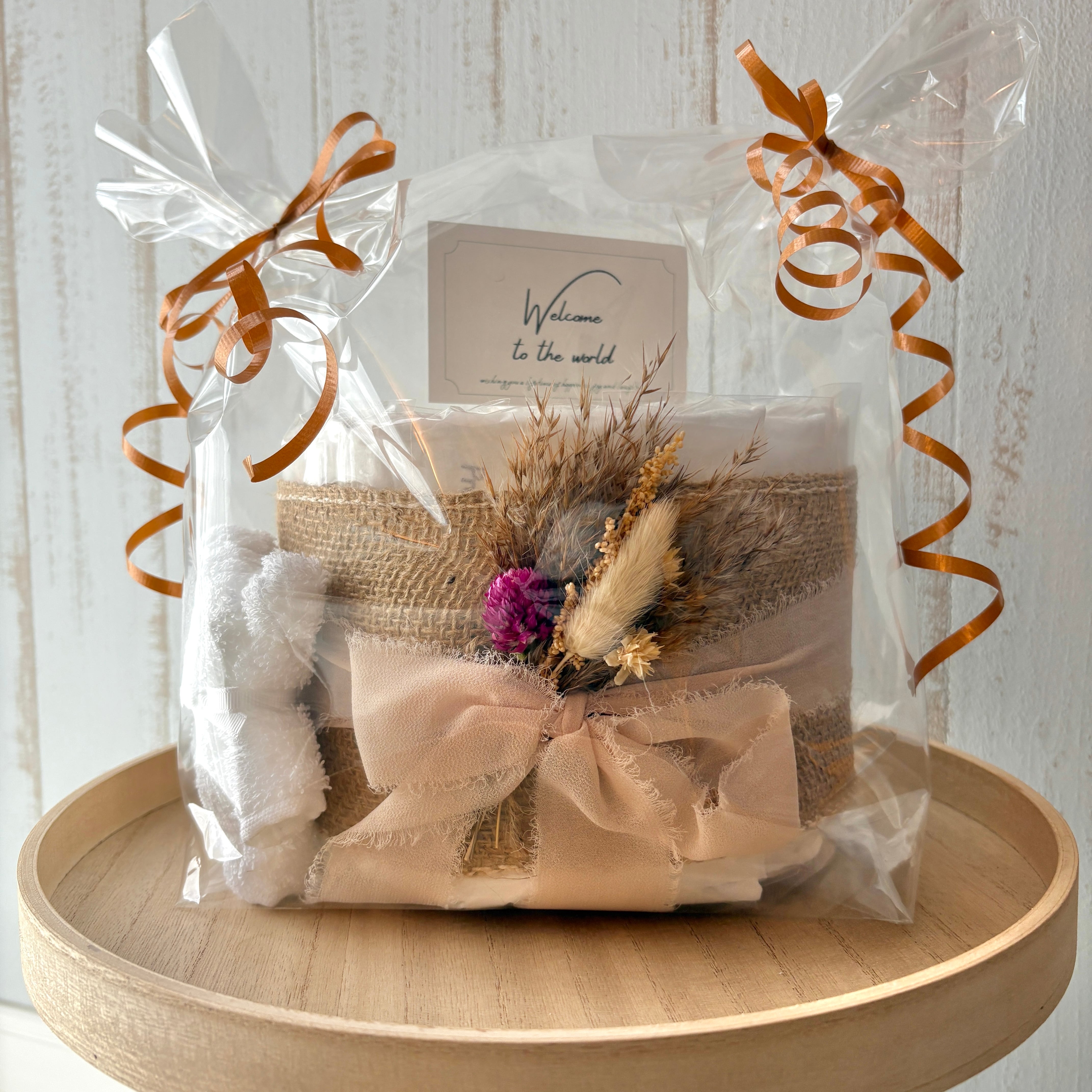 ベビーシャワーや出産祝いにぴったりのおむつケーキ。
