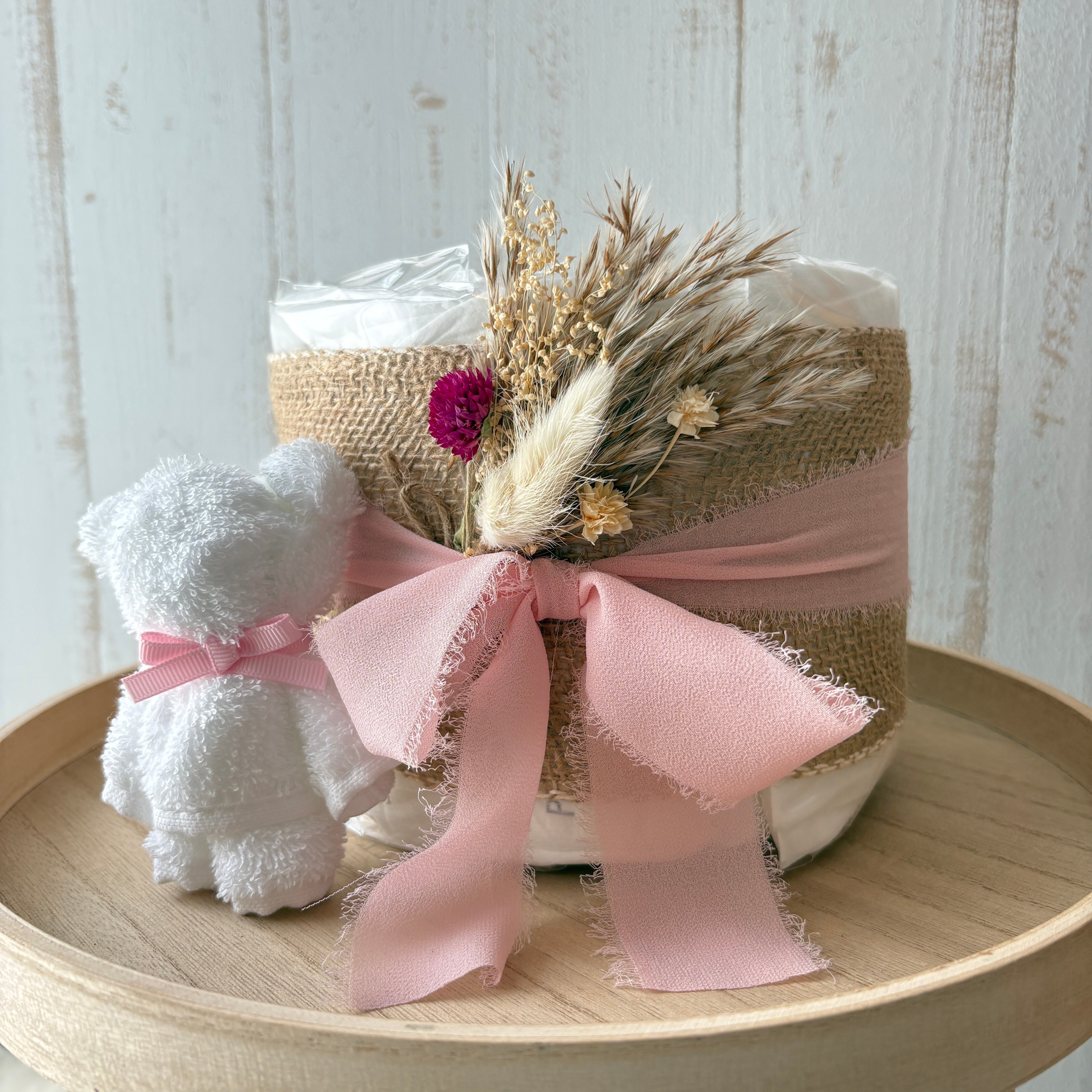 ベビーシャワーや出産祝いにぴったりのおむつケーキ。